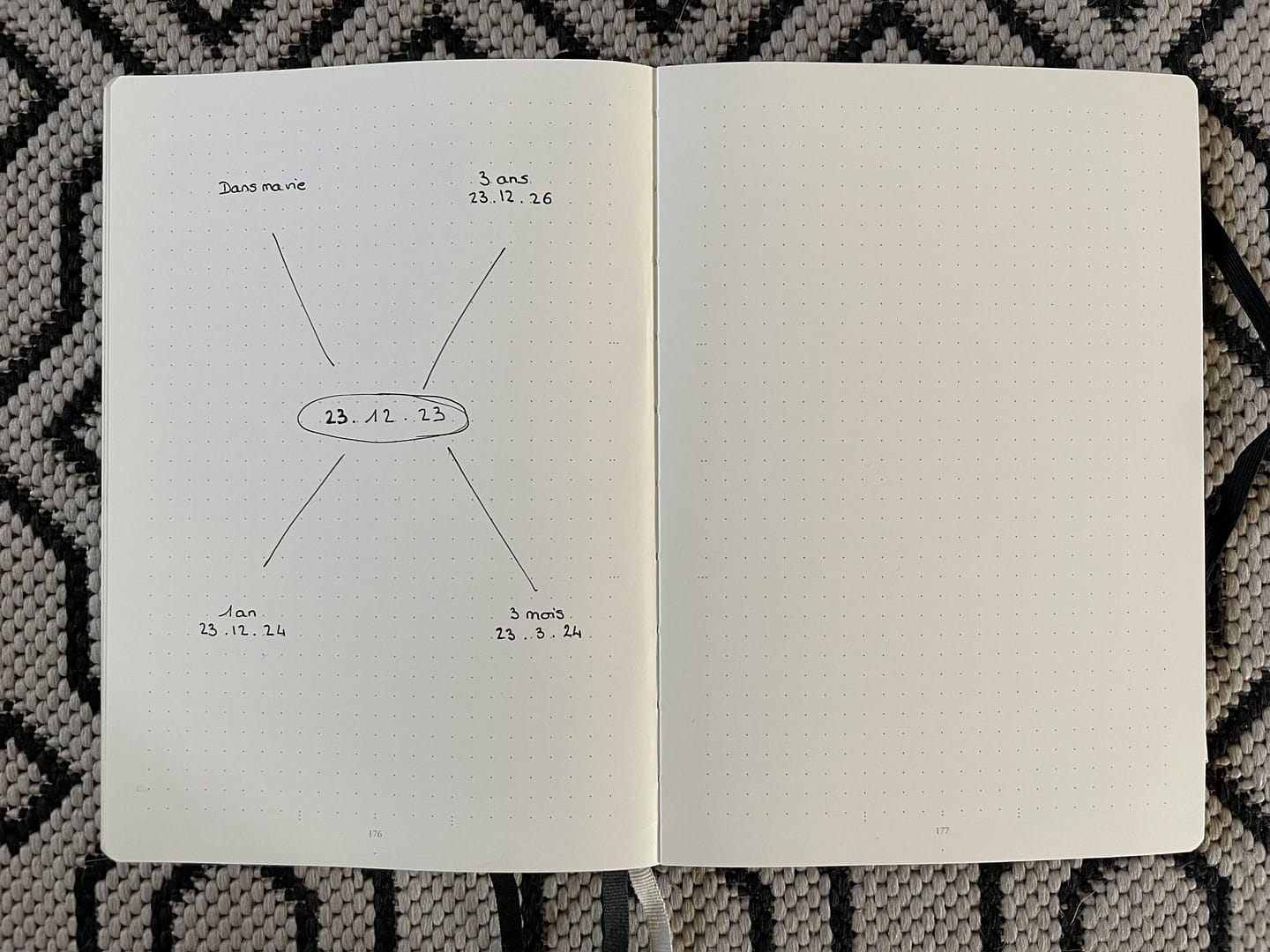 - Aux quatre coins de notre page nous allons récrire les dates suivantes : J+3 mois en bas à droite, J+1 an en bas à gauche, J+3 ans en haut à droite, puis « dans ma vie » en haut à gauche. Nous allons chacune les relier d’un trait à la date du jour au centre de la page.